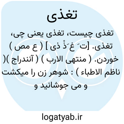 تغذی. [ت َ غ َذْ ذی ] ( ع مص ) خوردن. ( منتهی الارب ) ( آنندراج )( ناظم الاطباء ): شوهر زن را میکشت و می جوشانید و با اجزا و اعضاء او تزجی و تغذی میکرد. ( ترجمه تاریخ یمینی چ اول تهران ص 327 ). || مطاوع تغذیه. ( از اقرب الموارد ). رجوع به تغذیه شود.