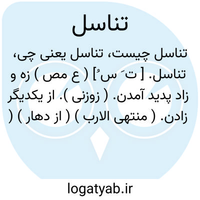 تناسل. [ ت َ س ُ] ( ع مص ) زه و زاد پدید آمدن. ( زوزنی ). از یکدیگر زادن. ( منتهی الارب ) ( از دهار ) ( آنندراج ) ( ناظم الاطباء ) ( از اقرب الموارد ). از هم زائیدن. ( غیاث اللغات ): هرکه خدمت... کسی را کند که قدر آن نداند همچنان آن کس است که بصورت گرمابه بهوس تناسل عشق آرد. ( کلیله و دمنه ). تا دامن قیامت از توالد و تناسل ایشان مؤمن و مؤمنه می زاید. ( کلیله و دمنه ). بقاء ذات تو بدوام تناسل ما متعلق است. ( کلیله و دمنه ).