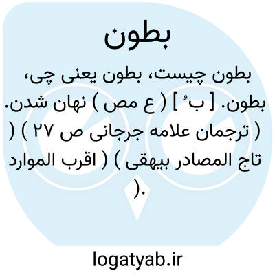 بطون. [ ب ُ ] ( ع مص ) نهان شدن. ( ترجمان علامه جرجانی ص 27 ) ( تاج المصادر بیهقی ) ( اقرب الموارد ). پنهان شدن چیزی. ( ناظم الاطباء ). || از خواص کسی شدن. ( تاج المصادر بیهقی ). || پوشیدن و پوشیدگی. ( غیاث ). || ( اِ ) درون چیزی. ( از ناظم الاطباء ).