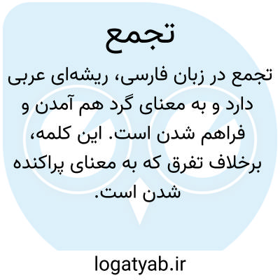 تجمع در زبان فارسی، ریشه‌ای عربی دارد و به معنای گرد هم آمدن و فراهم شدن است. این کلمه، برخلاف تفرق که به معنای پراکنده شدن است، بر گردهمایی و اتحاد دلالت دارد. بر اساس منابع معتبر لغوی مانند تاج المصادر بیهقی، منتهی الارب، ناظم الاطباء، اقرب الموارد و قطر المحیط، تجمع به طور کلی به معنی گردآمدن از هر سو و فراهم آمدن اشیاء یا افراد است. این مفهوم، در فرهنگ عامه و ادبیات فارسی نیز به کرات به کار رفته و بار معنایی همبستگی و اتحاد را منتقل می‌کند.