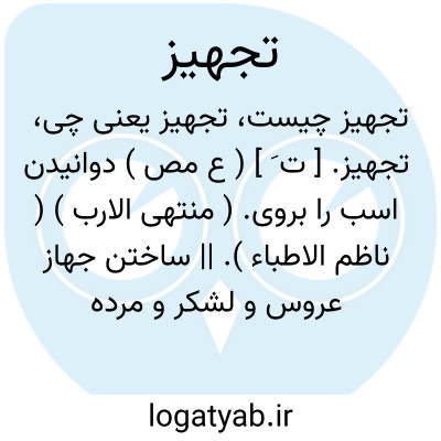 تجهیز. [ ت َ ] ( ع مص ) دوانیدن اسب را بروی. ( منتهی الارب ) ( ناظم الاطباء ). || ساختن جهاز عروس و لشکر و مرده و مسافر و غازی و مانند آن. ( منتهی الارب ) ( ناظم الاطباء ) ( از آنندراج ) ( از اقرب الموارد ) ( از قطر المحیط ) ( از غیاث اللغات )( از فرهنگ نظام ): و لما جَهزَهُم بجهازِهِم قال َ ائتونی باَخ لکم من ابیکم. ( قرآن 59/12 ).