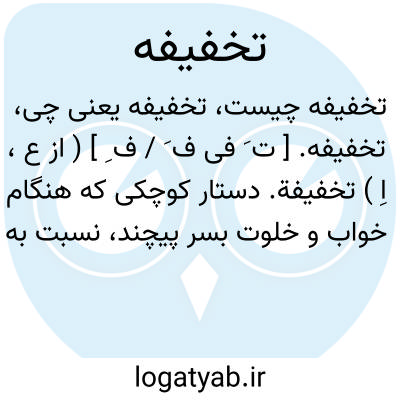 تخفیفه. [ ت َ فی ف َ / ف ِ ] ( از ع، اِ ) تخفیفة. دستار کوچکی که هنگام خواب و خلوت بسر پیچند، نسبت به عمامه سبک میباشد. ( آنندراج ). عمامه کوچکی که در هنگام خوابیدن و یا در رفتن بیت الخلاء بر سر می گذارند. ( ناظم الاطباء ): علی رأسه کوفیة و تخفیفة صغیرة. ( عیون الانباء ج 2 ص 177 ).