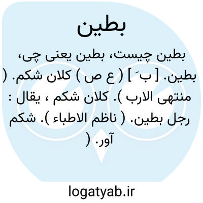 بطین. [ ب َ ] ( ع ص ) کلان شکم. ( منتهی الارب ). کلان شکم، یقال: رجل بطین. ( ناظم الاطباء ). شکم آور. ( مهذب الاسماء ). شخص بزرگ شکم. ( فرهنگ نظام ). بزرگ شکم. ( آنندراج ) ( غیاث ). || آنکه شکم وی پر باشد. ( ناظم الاطباء ). || توانگر. ( منتهی الارب ). || دور و بعید، یقال: شاءو بطین. ( منتهی الارب ). دور و بعید. ( ناظم الاطباء ) ( آنندراج ). || ( اِخ ) لقب شخصی است. ( آنندراج ). لقب مردی خارجی. ( منتهی الارب ) ( از ناظم الاطباء ).