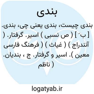 بندی. [ ب َ ] ( ص نسبی ) اسیر. گرفتار. ( آنندراج ) ( غیاث ) ( فرهنگ فارسی معین ). اسیر و گرفتار. ج، بندیان. ( ناظم الاطباء ). اسیر. ( ترجمان القرآن ). زندانی. ج، بندیان. ( فرهنگ فارسی معین ). محبوس. مسجون. مغلول: