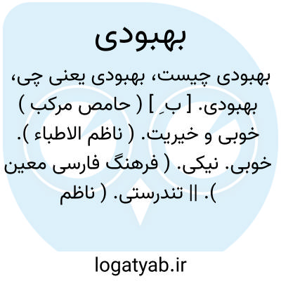 بهبودی. [ ب ِ ] ( حامص مرکب ) خوبی و خیریت. ( ناظم الاطباء ). خوبی. نیکی. ( فرهنگ فارسی معین ). || تندرستی. ( ناظم الاطباء ) ( فرهنگ فارسی معین ). || زور و توانائی. || ( اِ ) کنایه از خنجر و دشنه. ( ناظم الاطباء ).