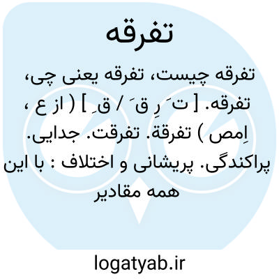 تفرقه. [ ت َ رِ ق َ / ق ِ ] ( از ع، اِمص ) تفرقة. تفرقت. جدایی. پراکندگی. پریشانی و اختلاف: با این همه مقادیر آسمانی و حوادث روزگار آنرا در معرض تفرقه آرد. ( کلیله و دمنه ).