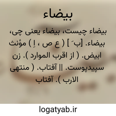 بیضاء. [ب َ ] ( ع ص، اِ ) مؤنث ابیض. ( از اقرب الموارد ). زن سپیدپوست. || آفتاب. ( منتهی الارب ). آفتاب بعلت سپیدی آن. ( از لسان العرب ) ( از تاج العروس ). مهر. خور. خورشید. شمس. شارق. ذکا. بوح. شرق. ( یادداشت مؤلف ). || نقره. ( از ذیل اقرب الموارد ).سیم: یا صفراء یا بیضاء غری غیری. ( از سخنان علی بن ابیطالب ( ع ) ). || کاغذ سفید. ( ناظم الاطباء ). اما این معنی در فرهنگهای معتبر عربی دیده نشد.