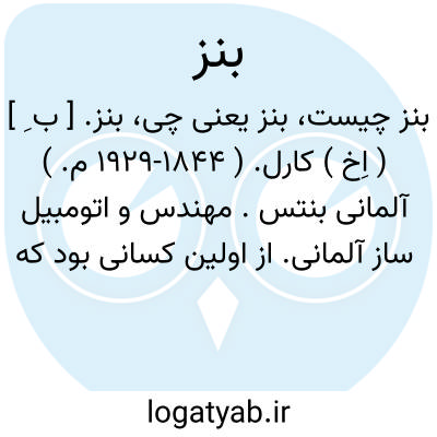 بنز. [ ب ِ ] ( اِخ ) کارل. ( 1844-1929 م. ) آلمانی بنتس. مهندس و اتومبیل ساز آلمانی. از اولین کسانی بود که وسیله نقلیه موتوری ساخت. اختراع دیفرانسیل به او منسوب است. شرکت بنز را در ماتهایم تأسیس کرد. در سال 1926 شرکت بنز با شرکت م. وایملر یکی شد. و این شرکت به ساختن اتومبیلهای معروف به مرسدس بنز پرداخت. ( دایرةالمعارف فارسی ).