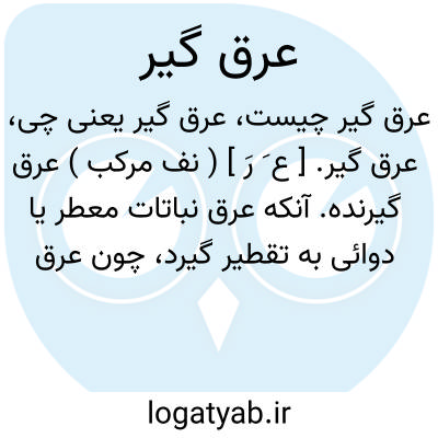 عرق گیر. [ ع َ رَ ] ( نف مرکب ) عرق گیرنده. آنکه عرق نباتات معطر یا دوائی به تقطیر گیرد، چون عرق بیدمشک و عرق کاسنی و عرق بید، یا گلاب از گل و جز آن. ( یادداشت مرحوم دهخدا ). کسی که عرق از چیزی میگیرد. ( ناظم الاطباء ). || آنکه عرق شراب و الکل کشد. || آنکه عصاره میوه ها را گیرد. عصار. ( فرهنگ فارسی معین ). || کنایه از شرمنده و منفعل. ( آنندراج ). کنایه از خجل و شرمنده. ( برهان ). || عرق آلود. ( آنندراج ):