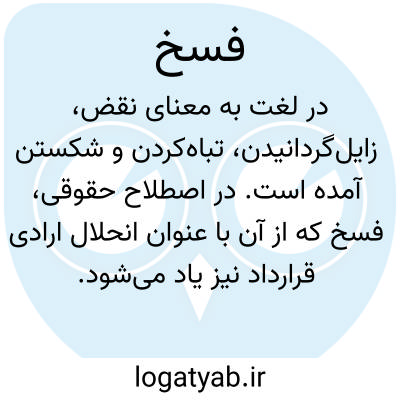 [ویکی فقه] فسخ (فقه). فسخ در لغت به معنای نقض، زایل گردانیدن، تباه کردن و شکستن آمده است.فسخ که به آن انحلال ارادی قرار داد نیز گفته می شود، در اصطلاح حقوقی عبارت است از پایان دادن حقوقی به قرار داد به وسیله یکی از دو طرف قرارداد یا شخص ثالث.فسخ یا انحلال ارادی قرارداد از حیث جایگاه حقوقی یکی از مباحث اسباب سقوط تعهدات و قراردادها می باشد.بحث فسخ قرارداد، اختصاص به عقود لازم دارد، چرا که در عقود جائز هر کدام از طرفین می تواند هر زمان که اراده کند، عقد را بر هم زند. بحثی که در عقود لازم مطرح است آن است که آیا مدعی فسخ عقد، حق فسخ دارد یا این که باید به عقد ملتزم بماند؟