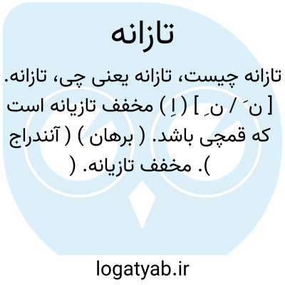 تازانه. [ ن َ / ن ِ ] ( اِ ) مخفف تازیانه است که قمچی باشد. ( برهان ) ( آنندراج ). مخفف تازیانه. ( فرهنگ جهانگیری ) ( فرهنگ رشیدی ) ( فرهنگ خطی کتابخانه مؤلف ) ( انجمن آرا ). تازیانه. ( شرفنامه منیری ). شلاق. محمد معین در حاشیه برهان آرد: از تازان + ه ( آلت )، پهلوی تاچانک: