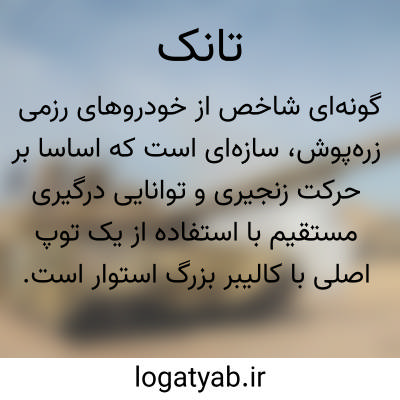 تانک. ( انگلیسی، اِ ) ارابه بزرگ جنگی است که انگلیسیها در اثنای جنگ بین المللی اول اختراع کردند که در هر زمین ناهمواری میتواند عبور کند. ( فرهنگ نظام ). تانگ، کلمه انگلیسی و ارابه زره دار جنگی است که با توپ و مسلسل مسلح است و چرخهای آن که از دنده های پولادین درست شده است بر روی نوارهای زنجیرمانندی از پولاد حرکت کند و جنگ آوران در میان آن که چون دژی پولادین و متحرک است نشینند و بدشمن تازند. اولین تانک در پایان سال 1916 م. بوسیله انگلیسیها ساخته و وارد میدان جنگ شد ولی در جنگ دوم جهانی از سلاحهای مؤثر و قابل توجه جنگ بشمار آمد.