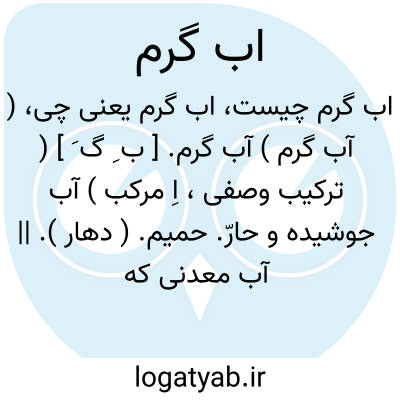 ( آب گرم ) ( اسم ) ۱ - آب جوشیده و حار. ۲ - آب معدنی گرم که از زمین جوشد. ۳ - محلی که در آن آب معدنی باشد. ۴ - سرشک اشک. ۵ - شراب باده می.