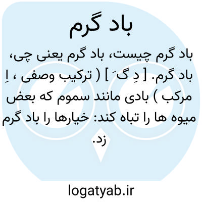 باد گرم. [ دِ گ َ ] ( ترکیب وصفی، اِ مرکب ) بادی مانند سموم که بعض میوه ها را تباه کند: خیارها را باد گرم زد. بادی حار که صیفی را تباه کند. هوف [ هََ/ هو ]. سَهام. باد سَموم. حَرور. ( منتهی الارب ) ( ترجمان القرآن ): بارِح؛ باد گرم تابستان. ( منتهی الارب ) ( مهذب الاسماء ). مُذْبِلة؛ باد گرم پژمرده کننده گیاه. ( منتهی الارب ). رجوع به بادزدگی و باد زدن شود.
