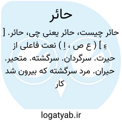 حائر. [ ءِ ] ( ع ص، اِ ) نعت فاعلی از حیرت. سرگردان. سرگشته. متحیر. حیران. مرد سرگشته که بیرون شد کار نداند. || جای گرد آمدن آب. || لاغر. نزار. || مغاکی که در آن آب باران گرد آید در دشت و جز آن. || جای پست. حَیر. || بستان. ج، حوران، حیران. || چربش گوشت. پیه. چربو. || ( اِخ ) کربلا،یا موضعی به کربلا در ساحل نهر حسینی، شعبه فرات که روضه حسین بن علی علیهماالسلام بدانجاست. || ( ص ) حائرٌ بائرٌ؛ از اتباع است؛ ای هالک ٌ کاسد.