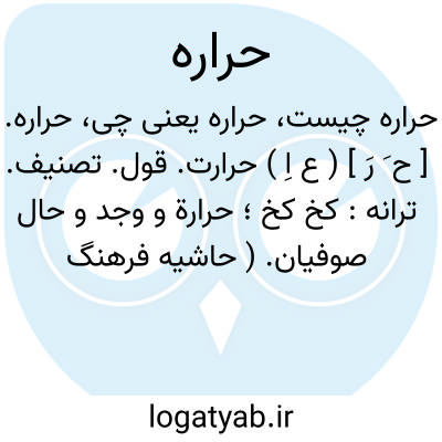 حراره. [ ح َ رَ ] ( ع اِ ) حرارت. قول. تصنیف. ترانه: کخ کخ؛ حرارة و وجد و حال صوفیان. ( حاشیه فرهنگ اسدی نسخه خطی نخجوانی ). حال. ملمع. شرقی. عروض البلد. زجل. موشح. موشحه. ترانه. دف زدن بشادی. کان و کان. کاری. موالیا. قوماه. ملعبه.رقص کردن و تاب دادن دف را از آتش و آوازی که از چند ساز و چند حلق یکمرتبه برآید و غوغای مردم. ( غیاث اللغات از لطائف اللغات و شرحهای مثنوی ). ترانه چندنفر که یک آواز و یک حلق با هم خوانند، کما فی بعض الحواشی. ( از حاشیه مثنوی چ علاءالدوله ). || آهنگی از موسیقی است. رجوع به آهنگ شود: