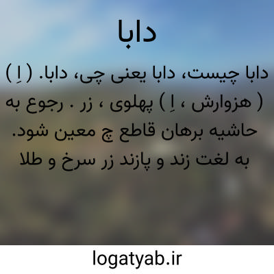 دابا. ( اِ ) ( هزوارش، اِ ) پهلوی، زر. رجوع به حاشیه برهان قاطع چ معین شود. به لغت زند و پازند زر سرخ و طلا را گویند و به عربی ذهب خوانند. ( برهان ).