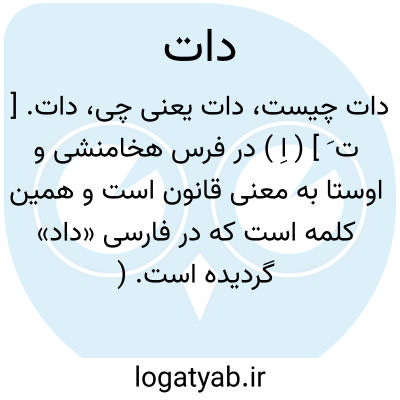 دات. [ ت َ ] ( اِ ) در فرس هخامنشی و اوستا به معنی قانون است و همین کلمه است که در فارسی «داد» گردیده است. ( فرهنگ ایران باستان ج 1 ص 57 ).