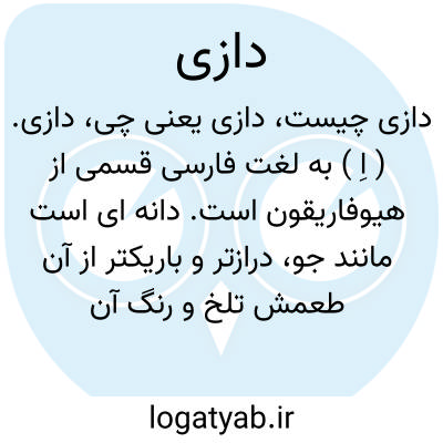 دازی. ( اِ ) به لغت فارسی قسمی از هیوفاریقون است. دانه ای است مانند جو، درازتر و باریکتر از آن طعمش تلخ و رنگ آن تیره است. از جبال فارس خیزد و گرم و خشک است و قوتش تا چهارسال باقی ماند. مسکن و ملین صلابات است. جهت درد مقعد و استرخاء آن و بواسیر و اسهال و رفع سموم تفتیح سدد و تحلیل ریاح و درد رحم و لعوق آن با عسل جهت دفع کرم معده و سیلان آب دهان مفید است. نشستن در طبیخ آن جهت خروج مقعد، و با روغن زیتون جهت بواسیر نافع و مورث سدد و دوار و اکثار آن کشنده و مصلحش انیسون و قدر شربتش تا دو درهم و بدلش نصف آن بادام و دو ثلث آن ابهل است. ( از تحفه حکیم مؤمن چ سنگی بخط نسخ ص 104 ).