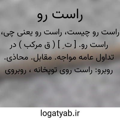 راست رو. [ ت ِ ] ( ق مرکب ) در تداول عامه مواجه. مقابل. محاذی. روبرو: راست روی توپخانه، روبروی توپخانه. ( یادداشت مؤلف ).، راسترو. [ رَ / رُو ] ( نف مرکب ) مقابل کجرو. ( آنندراج ) ( ارمغان آصفی ). راست رونده.مستقیم حرکت کننده. بی انحراف و کجی رونده. که بخط مستقیم طی طریق کند. که از استقامت نگردد: