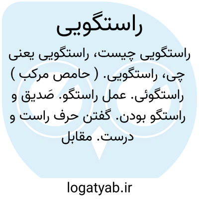 راستگویی. ( حامص مرکب ) راستگوئی. عمل راستگو. صَدیق و راستگو بودن. گفتن حرف راست و درست. مقابل دروغگویی. صداقت. صدق: و همه پیغامبران را به راستگویی داری. ( منتخب قابوسنامه ص 15 ).