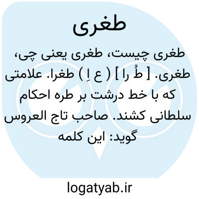 طغری. [ طُ را ] ( ع اِ ) طغرا. علامتی که با خط درشت بر طره احکام سلطانی کشند. صاحب تاج العروس گوید: این کلمه تتری است و اصل آن طورغای باشد و فارس و روم ( مقصود ترک عثمانی است ) آن را استعمال کنند. ج، طغراوات. و آن را پس از طره و پیش از بسمله به منشور ملصق میکرده اند. || وُلف در لغات شاهنامه طغری را بمعنی شاهین یا مرغ شکاری دیگر دانسته و این بیت شاهنامه را نیز شاهد آورده است: