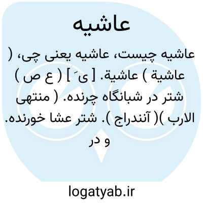( عاشیة ) عاشیة. [ ی َ ] ( ع ص ) شتر در شبانگاه چرنده. ( منتهی الارب )( آنندراج ). شتر عشا خورنده. و در مثل است: العاشیة تهیج الاَّبیة، یعنی هر گاه ببیند کسی را که از خوردن غذای شب امتناع میورزد از او پیروی میکند و غذای شب را با وی میخورد. ( از اقرب الموارد ) ( تاج العروس ).