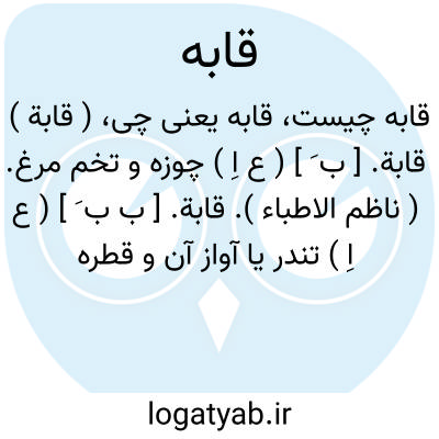لغت نامه دهخدا ( قابة ) قابة. [ ب َ ] ( ع اِ ) چوزه و تخم مرغ. ( ناظم الاطباء ).قابة. [ ب ب َ ] ( ع اِ ) تندر یا آواز آن و قطره باران. ( منتهی الارب ): ما اصابتنا العام قابة. ( مهذب الاسماء ).