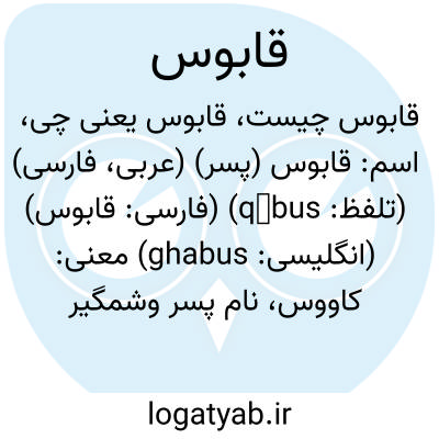معنی: کاووس، نام پسر وشمگیر از امرای آل زیار، ( اَعلام ) شمس المعالی قابوس وشمگیر: امیر [، قمری] سلسله ی زیاریان در شمال ایران، که بر اثر شکست از سپاهیان آل بویه به سامانیان پناه برد و سال را در تبعید گذراند، تا دوباره سلطنتش را به دست آورد، سرانجام به دست سپاهیانش کشته شد، ( معرب کاووس )، ( در اعلام ) قابوس ابن وشمگیر بن زیار ملقب به شمس المعالی از پادشاهان آل زیار ( قرن پنجم هـ ق )، معرب از فارسی، کاووس کاووس