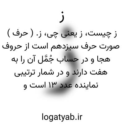 ز. ( حرف ) صورت حرف سیزدهم است از حروف هجا و در حساب جُمَّل آن را به هفت دارند و در شمار ترتیبی نماینده عدد 13 است و نام آن زاء، زای، زی و ز است. و آن را در مقابل زاء غلیظه «ژ»، زاء خالصه و زاء اخت الراء گویند و در تجوید از حروف اسلیه و مائیه و حروف مهجوره و نیزاز حروف مصمته مکسوره باشد و در اصطلاح وقوف سجاوندی علامت خاصه برای مواضعی از آیات قرآن است که وصل در آنها اصل و وقف نیز مستحسن باشد. و در تقویم نگاری نماینده روز شنبه است. و نیز مراد از این حرف برج عقرب باشد. مؤلف نفائس الفنون صورت حرف «ز» را در خط عربی بدین گونه تعریف کند: و مقدار سر زای دو نقطه است. و گفته اند که ربع مجموع او باشد. از طرف بالا باریکتر فرا گیرند و طرف زیرین از آن غلیظتر چه او مرکب است از یک خط مقوس و ربع دائره. ( نفائس الفنون ص 10 ). و رمز زائد است اندر کتابت چون کاتب چیزی زیاده بر اصل نویسد و بر سر کلمه اول «ز» و آنجا که قسمت زائد ختم شده بر بالای آخرین کلمه «الی » گذارند. و این برای آن است که مکتوب را محو نکنند و بر آن خط نکشند.