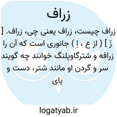 زراف. [ زَ ] ( از ع، اِ ) جانوری است که آن را زرافه و شترگاوپلنگ خوانند چه گویند سر و گردن او مانند شتر، دست و پای او همچون دست و پای گاو و بدن او به پلنگ می ماند. ( برهان ). حیوانی که آن را اشترگاوپلنگ گویند... در نفایس الفنون مسطور است که او را دو شاخ باشد، مثل شاخ آهو سیاه رنگ و گوش و پای او به گوش وپای گاو ماند و دهان و سوراخ بینی او بدهان و بینی گاومیش و دم مشابه بدم شتر و پوست او منقش بود چون پوست پلنگ. و در سراج نوشته که دندانش بدندان خر ماندو هر دو دست دراز و هر دو پای کوتاه. بیشتر در ولایت نوبه بهم می رسد. ( غیاث اللغات ). زرافه که یکی از حیوانات پستاندار نشخوارکن است و دارای گردنی دراز و آن را شترگاوپلنگ و زرناپا نیز گویند. ( ناظم الاطباء ).حیوانی است معروف... و این لغت عربی است نه پارسی. زرافه نیز گویند. ( انجمن آرا ) ( آنندراج ):