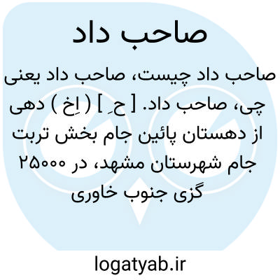 صاحب داد. [ ح ِ ] ( اِخ ) دهی از دهستان پائین جام بخش تربت جام شهرستان مشهد، در 25000 گزی جنوب خاوری تربت جام، سر راه مالروعمومی تربت جام به قلعه حمام. جلگه، معتدل و سکنه 272 تن شیعه و حنفی ( ؟ ) فارسی زبان، آب آن از قنات و محصول آن غلات، پنبه، تریاک و شغل زراعت، مالداری است.راه مالرو دارد. ( از فرهنگ جغرافیائی ایران ج 9 ).