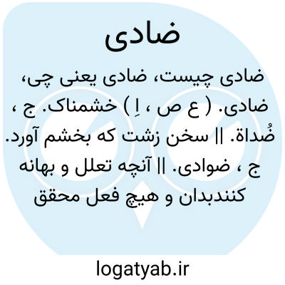 ضادی. ( ع ص، اِ ) خشمناک. ج، ضُداة. || سخن زشت که بخشم آورد. ج، ضوادی. || آنچه تعلل و بهانه کنندبدان و هیچ فعل محقق نشود برای وی. ( منتهی الارب ).
