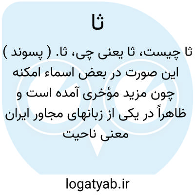 ثا. ( پسوند ) این صورت در بعض اسماء امکنه چون مزید مؤخری آمده است و ظاهراً در یکی از زبانهای مجاور ایران معنی ناحیت یا زمین یا قریه یا شهر میداده است. مانند اکشوثا، باحسیثا، باعیناثا، باقسیاثا، براثا، تلقیاثا، توماثا، جبثا، جثا، جواثا، جوثا، حندوثا، خناثا، دبثا، دببثا، شلاثا، طیثثا، قبراثا، قسیاثا، کراثا، کفرتوثا، کفرلاثا، کفرلهثا، مصراثا، معراثا، هلثا، یکشوثا.