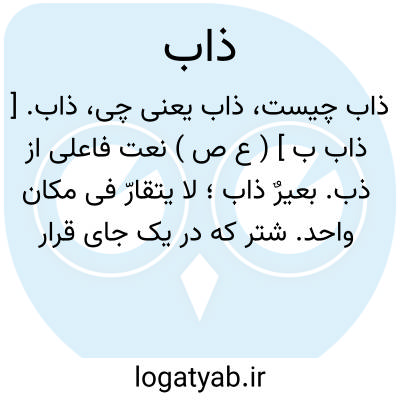 ذاب. [ ذاب ب ] ( ع ص ) نعت فاعلی از ذب. بعیرٌ ذاب؛ لا یتقارّ فی مکان واحد. شتر که در یک جای قرار نگیرد.