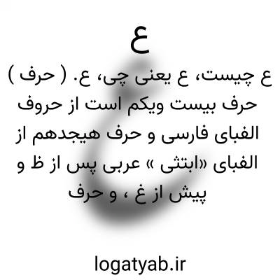 ع. ( حرف ) حرف بیست ویکم است از حروف الفبای فارسی و حرف هیجدهم از الفبای «ابتثی » عربی پس از ظ و پیش از غ، و حرف شانزدهم از الفبای ابجدی پس از س و پیش از ف، و نام آن عین است و به حساب جُمّل نماینده عدد هفتاد بود. ( فرهنگ نظام ) ( آنندراج ). و از حروف ششگانه حلق و از حروف تُرابیه یا أرضیه است. ( برهان ). و از حروف مصمته است. ( آنندراج ). || رمزی است علیه السلام را که صورت دیگر آن «4» است. || در فرهنگها علامت عربی بودن کلمه است. || و در هیئت علامت تربیع است. || و نیز علامت مصراع است یعنی نصف بیت. || در معجم های جغرافیائی رمز است موضع را. || و رمزی است عین بمعنی چشمه را. || این حرف در تمام زبانهای سامی بوده و نامش در تهجی عبرانی عین است بمعنی چشم چه شکل حرف مذکور در آن زبان شباهت بچشم دارد اما این تطبیق لفظ و معنی بر سبیل اتفاق است و الا حروف عربی از عبرانی بدون ملاحظه معنی گرفته شده است. ( فرهنگ نظام ) ( آنندراج ). || این حرف از حروف مخصوص کلمات عربی است و در زبان فارسی صدای همزه دارد و در کلماتی دیده میشود که فارسیان از زبان عربی گرفته اند مانند عمر، عالی، عارض و یا از کلماتی که عربها در آن تصرف کرده اند مانند عاقرقرحا و نعناع و جز آن. ( ناظم الاطباء ).