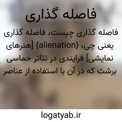 {alienation} [هنرهای نمایشی] فرایندی در تئاتر حماسی برشت که در آن با استفاده از عناصر متعدد، ازجمله نور و موسیقی و نحوۀ بازی، از غرقه شدن تماشاگر و بازیگر در نمایش جلوگیری می شود