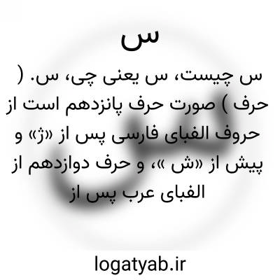 س. ( حرف ) صورت حرف پانزدهم است از حروف الفبای فارسی پس از «ژ» و پیش از «ش »، و حرف دوازدهم از الفبای عرب پس از «ز» و پیش از «ش »، و حرف پانزدهم از الفبای ابجدی پس از «ن » و پیش از «ع ». و نام آن سین است و آن را سین مهمله نامند. و بحساب جُمّل آن را شصت = 60 گیرند. || «س » از حروف اسلیّه و مهموسه و مصمته و شمسیه است و مخرج آن میان مخرج صاد و زاء باشد و از حروف مائیه است. ( برهان در کلمه هفت حرف آبی ) و هم از حروف مکسور. || در خط متبع: در سین باید که دندانه های باریکتر بود و همه مساوی یکدیگر در مقدار و نقش و خط و انعطاف. گفته اند که او شکلی است مرکب از شش خط منتصب و مقوس منتصب و دایره ای. ( نفائس الفنون ص 13 ). || شعرا دندان معشوق را بدندانه های «س » تشبیه کنند: