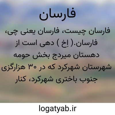 فارسان.( اِخ ) دهی است از دهستان میردج بخش حومه شهرستان شهرکرد که در 30 هزارگزی جنوب باختری شهرکرد، کنار راه شهرکرد به باباحیدر واقع است. جلگه ای معتدل و دارای 4024 تن سکنه است. آب آنجا از چشمه، رودخانه، سرآب و قنات تأمین میشود. محصول عمده اش غلات و حبوبات، وشغل اهالی زراعت و کسب است. پست بهداری، دبستان و راه ماشین رو دارد. ( از فرهنگ جغرافیائی ایران ج 10 ).