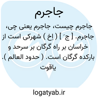 جاجرم. [ ج َ ] ( اِخ ) شهرکی است از خراسان بر راه گرگان بر سرحد و بارکده گرگان است. ( حدود العالم ). یاقوت نویسد: جاجرم نام شهر و ناحیه وسیعی است بین نیشابور و جوین و جرجان که قرای آباد متعدد دارد و اغلب آن در بر کوهی است مشرف به آزادور و آزادور قصبه معتبر جوین است. یاقوت نویسد: من بیشتر این دیه ها را گردش کرده ام. مؤلف نزهة القلوب آرد: جاجرم شهر کوچکی است. دور این شهر به فاصله یک فرسخ چمن است و در آن نباتات زهردارروید و به این جهت هنگام محاصره هیچ قشونی نمیتوانددر حوالی جاجرم اردو بزند. خانه های شهر بزرگ و بطرزخوش ساخته شده و در زیر دیوار ارک دو چنار است که پوست آنها معروف است برای معالجه درد دندان نافع است و اعتقاد اهل بلد این است که هر چهارشنبه صبح پوست این چنارها این خاصیت را دارد نه روزهای دیگر. مؤلف آنندراج نویسد: جاجرم معرب جاگرم است. رجوع شود به مسالک والممالک معروف به جهان نمای ترکی، تقویم البلدان، عجایب المخلوقات و مرآت البلدان ج 4 صص 21 - 24.