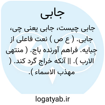 جابی. ( ع ص ) نعت فاعلی از جِبایه. فراهم آورنده باج. ( منتهی الارب ). || آنکه خراج گرد کند. ( مهذب الاسماء ). فراهم آورنده زکات و صدقه. عامل. ساعی. || ( اِ ) ملخ. ( منتهی الارب ).