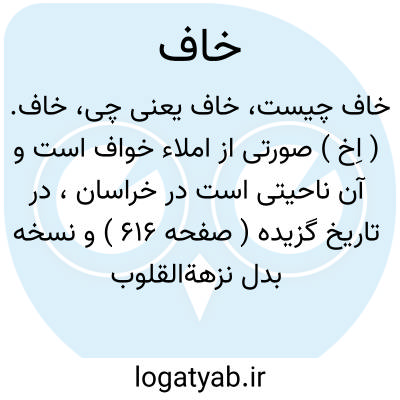 خاف. ( اِخ ) صورتی از املاء خواف است و آن ناحیتی است در خراسان، در تاریخ گزیده ( صفحه 616 ) و نسخه بدل نزهةالقلوب ( ج 3 ص 154 ) این املاء برای خواف بکار رفته است. رجوع به خواف شود.