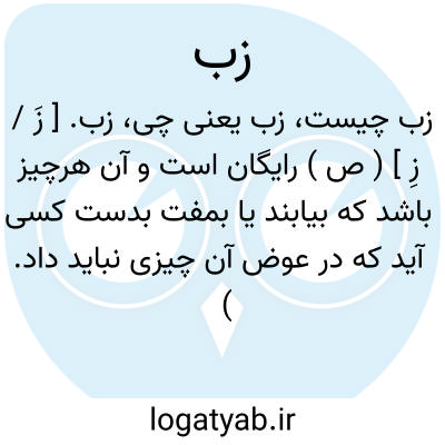 زب. [ زَ / زِ ] ( ص ) رایگان است و آن هرچیز باشد که بیابند یا بمفت بدست کسی آید که در عوض آن چیزی نباید داد. ( آنندراج ) ( برهان قاطع ). رایگان را گویند. ( فرهنگ جهانگیری ) ( شعوری ج 2 ص 47 و 42 ). مفت و رایگان و بلاعوض. ( ناظم الاطباء ). در لطایف بمعنی رایگان نیز آورده. ( غیاث اللغات ). || آسان. ( فرهنگ جهانگیری ). آسان مقابل دشوار. ( آنندراج ) ( برهان قاطع ). سهل و آسان. ( ناظم الاطباء ). آسان. ( فرهنگ شعوری ج 2 ص 48 و 42 ). در لطایف بمعنی آسان نیز آورده. ( غیاث اللغات ):