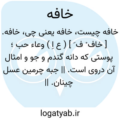 خافه. [ خاف ْ ف َ ] ( ع اِ ) وعاء حب؛ پوستی که دانه گندم و جو و امثال آن دروی است. || جبه چرمین عسل چینان. || خریطهائی که در آن عسل نهند. || سفره برداشته سرهاکه بخریطه ماند و در آن عسل چینند. ( منتهی الارب ).