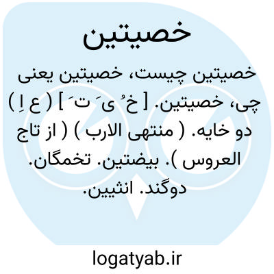 خصیتین. [ خ ُ ی َ ت َ ] ( ع اِ ) دو خایه. ( منتهی الارب ) ( از تاج العروس ). بیضتین. تخمگان. دوگند. انثیین. خلنتان. ( یادداشت بخط مؤلف ). این کلمه تثنیه خصیة است در حالت نصبی و جری.