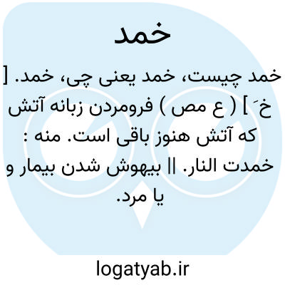 خمد. [ خ َ ] ( ع مص ) فرومردن زبانه آتش که آتش هنوز باقی است. منه: خمدت النار. || بیهوش شدن بیمار و یا مرد. منه: خمد المریض. || کم شدن سختی تب. || خوابانیدن آتش در جایی. ( منتهی الارب ) ( از لسان العرب ) ( از تاج العروس ).