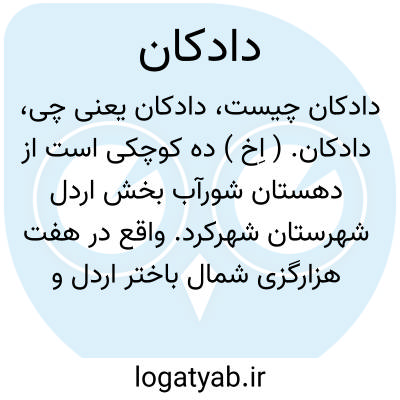 دادکان. ( اِخ ) ده کوچکی است از دهستان شورآب بخش اردل شهرستان شهرکرد. واقع در هفت هزارگزی شمال باختر اردل و دارای 74 سکنه. آب آن از چشمه. محصول آن غلات. شغل اهالی آن زراعت و راه آن مالرو است. ( از فرهنگ جغرافیایی ایران ج 10 ).