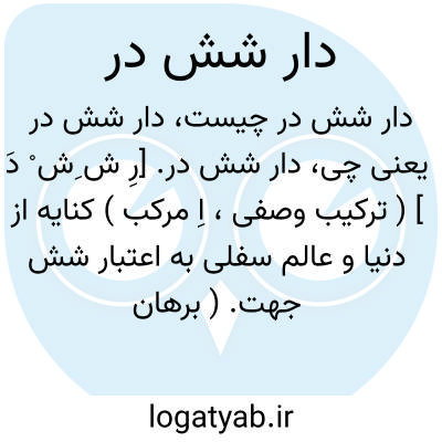 دار شش در. [رِ ش ِش ْ دَ ] ( ترکیب وصفی، اِ مرکب ) کنایه از دنیا و عالم سفلی به اعتبار شش جهت. ( برهان ):