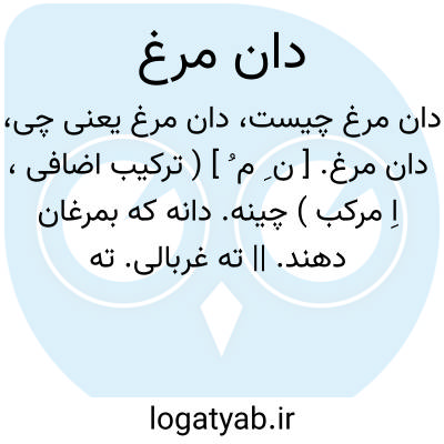 دان مرغ. [ ن ِ م ُ ] ( ترکیب اضافی، اِ مرکب ) چینه. دانه که بمرغان دهند. || ته غربالی. ته غربیلی. فضول از دانه های مختلف که از بوجاری گندم و جو و حبوب دیگر بدست آید. زیرغربالی. حصل. حصالة. || برف خوره. تگرگهای ریزه در زمستان پس از برف. تگرگ ریز چون ماشی و خردتر که گاهی بزمستان افتد. سرماریزه. سرماریزگی. بژپشنگک. بژ.