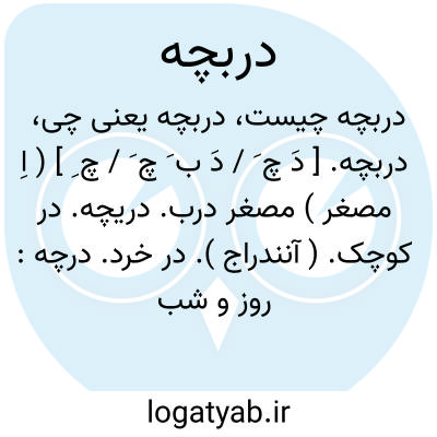 دربچه. [ دَ چ َ / دَ ب َ چ َ / چ ِ ] ( اِ مصغر ) مصغر درب. دریچه. در کوچک. ( آنندراج ). در خرد. درچه: